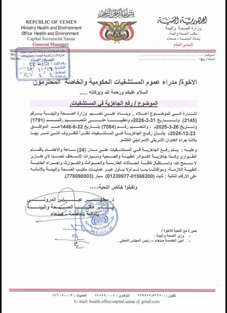 وبحسب الوثيقة الموجّهة من مدير مكتب الصحة بأمانة العاصمة صنعاء، مطهر المروني، إلى مديري عموم المستشفيات الحكومية والخاصة، فقد جرى التأكيد على «رفع الجاهزية الكاملة في المستشفيات على مدار الساعة».