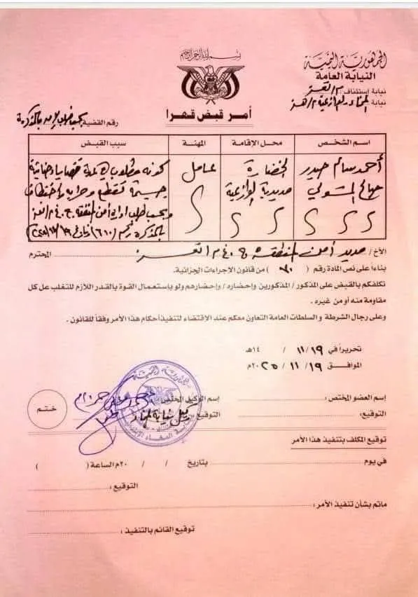 شهدت مديرية الوازعية، أمس، تصاعدًا في الجدل على خلفية تداول أوامر قهرية بحق شخص يدعى أحمد سالم حيدر المشولي، وسط توتر ميداني وحملة أمنية في المنطقة.