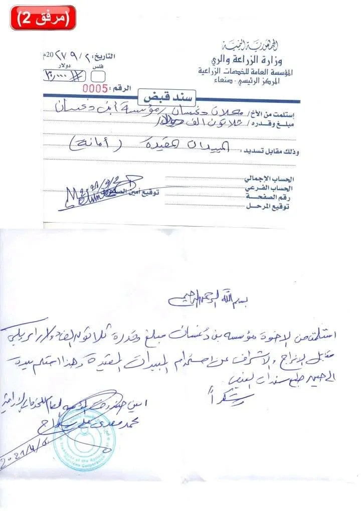كشفت وثيقة متداولة عن استلام ما تُسمّى وزارة الزراعة الخاضعة لسيطرة جماعة الحوثيين في صنعاء مبلغًا ماليًا قدره 30 ألف دولار أمريكي من مؤسسة ابن دغسان، مقابل الإفراج عن شحنة مبيدات مقيدة ومحرّمة دوليًا والإشراف عليها.