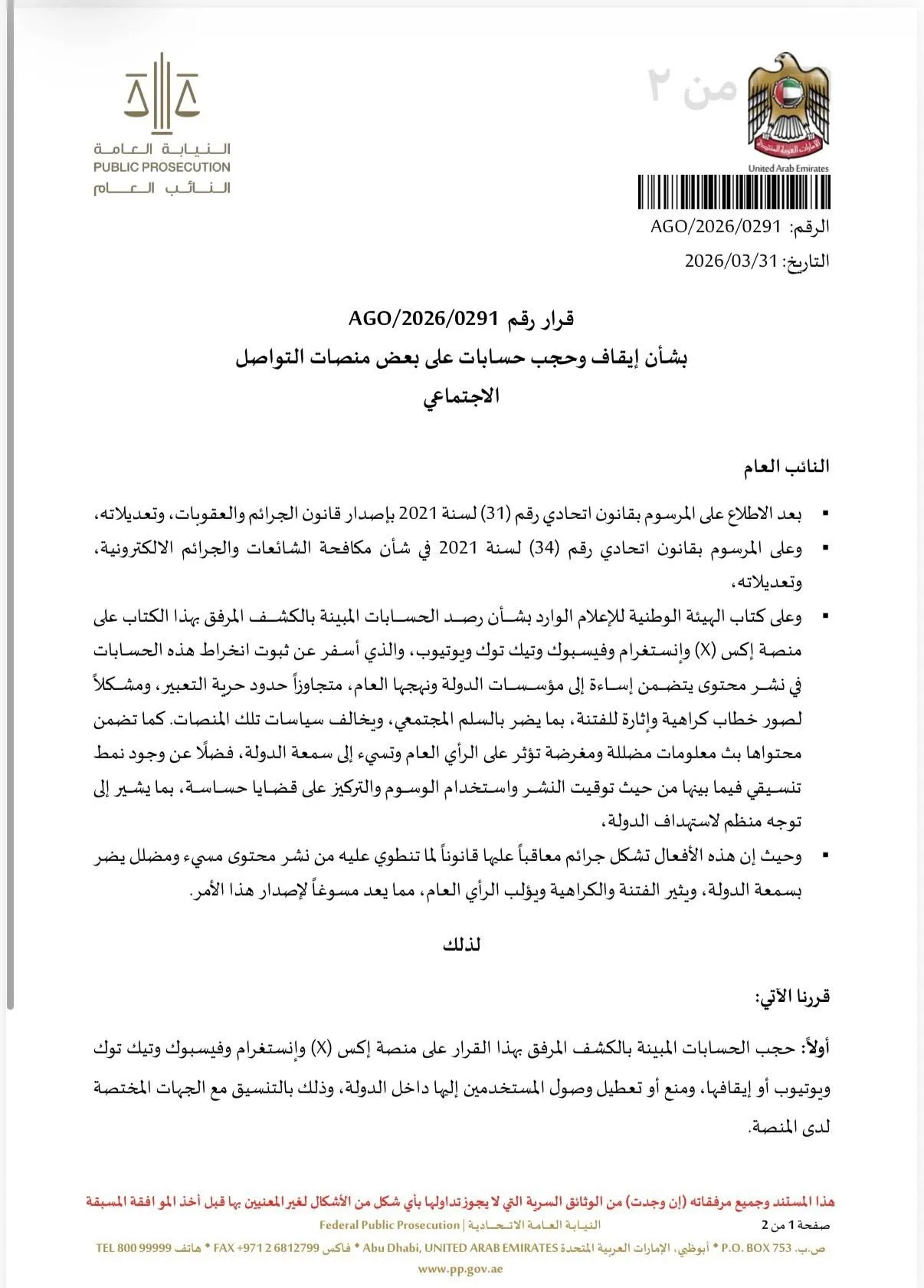 أصدرت النيابة العامة الإماراتية قرارًا رسميًا، بتاريخ 31 مارس 2026، يقضي بإيقاف وحجب عدد من الحسابات على منصات التواصل الاجتماعي، من بينها حسابات عربية ويمنية وسعودية.