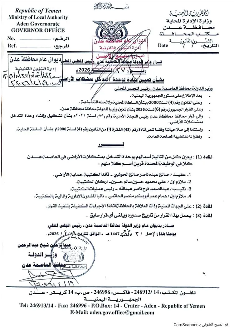 أصدر وزير الدولة محافظ العاصمة عدن عبدالرحمن شيخ، القرار رقم 27 لسنة 2026، بشأن تعيين قيادة لوحدة التدخل بمشكلات الأراضي.